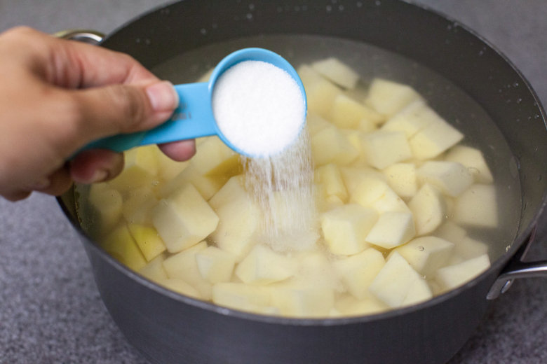 Сахар необходимо добавлять сразу после того, как вода в кастрюле закипит. Не следует сыпать слишком много, достаточно будет одной чайной ложки. Если добавить больше, то картофельные клубни получатся сладкими и невкусными. Если же четко следовать всем советам, то никакого лишнего привкуса не появится.