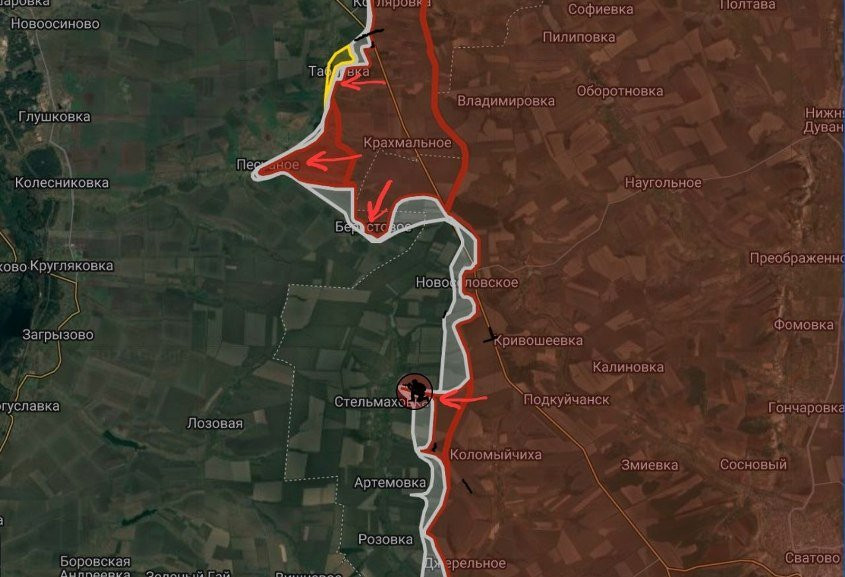 На Купянско-Лиманском направлении южнее Табаевки и западнее Крахмального российские войска продвинулись на участке шириной до 3.05 км на глубину до 3.25 км, войдя в Песчаное с юго-востока.