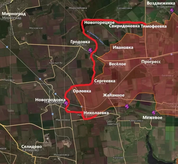 На Авдеевском участке ВС РФ продвинулись от Желанного и Новожеланного и вошли в Заветное, а также подходят к Птичьему, до которого остается около 1 км. Птичье - логистический узел ВСУ, через который снабжается восточная часть Селидово. Продвижение к Селидово составило примерно 1 км, наши подошли к террикону между деревнями Михайловкой и Мариновкой. Есть продвижение в Гродовке, где наши подходят к центру населённого пункта. Российские войска подошли вплотную к Новогродовке со стороны Николаевки. От Новогродовки открывается путь на Мирноград и Покровск. Однако наступление нашей армии двигается, похоже, не четко на запад, к Мирнограду, а на юго-запад, к Селидово и перспективой выйти к Времьевскому выступу. Таким образом вооруженные силы России обойдут с запада вторую линию украинской обороны на всем протяжении донецкого фронта от Очеретино до Угледара.