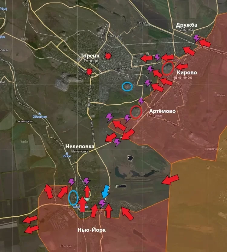 На Торецком направлении армия России продолжает успешно наступать вглубь Новгородского (Нью-Йорка). По разным оценкам сейчас под контролем Армии России 85-90% Новгородского. Подтверждается взятие под контроль терриконов шахт Северная и имени Артема. В самом Торецке наши военные ведут бои в первом крупном высотном массиве, который расположен на северо-востоке города со стороны Северного. Есть попытка войти в юго-восточную часть города через парковые массивы, сообщает в своём Telegram-канале Олег Царёв.