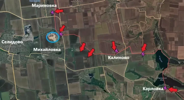 На Покровском направлении наши парни расширяют зону контроля восточнее и юго-восточнее Мариновки. Идут бои у террикона шахты Россия (Котляревского). От текущей линии фронта до восточного рубежа Селидово примерно 3 км. Селидово полностью обесточено, идет эвакуация. ВС РФ перерезали трассу Красноармейск (Покровск)-Карловка у Николаевки, нарушив логистику гарнизона ВСУ в Карловке. Российские войска зачистили плацдарм площадью 8 кв км северо-западнее Калиново, обходят село по флангам и продвигаются к Карловской трассе.