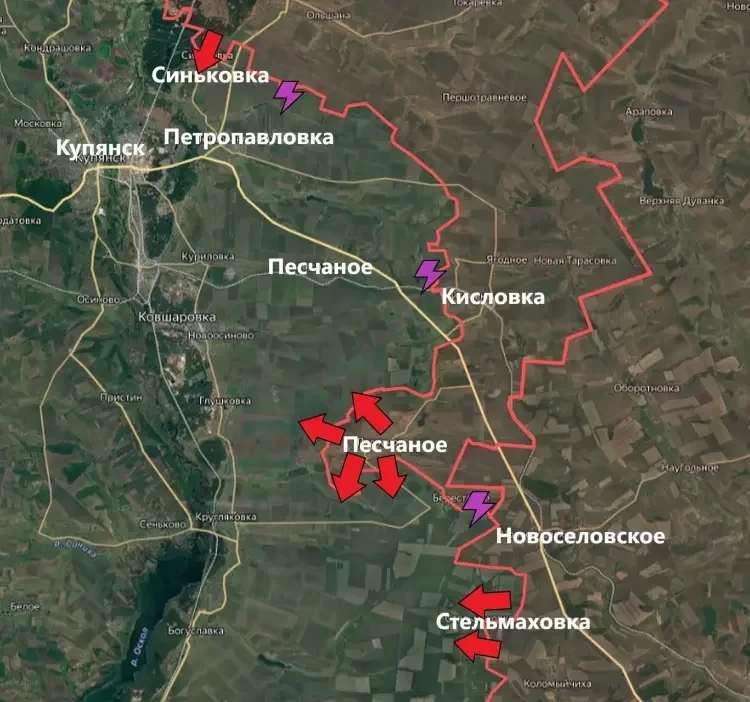 На Купянском направлении российская армия продвинулись в районе Песчаного и Табаевки, а также освободила Синьковку и, по некоторым данным, Стельмаховку. Об этом информирует в Telegram-канале военкор Евгений Лисицын.