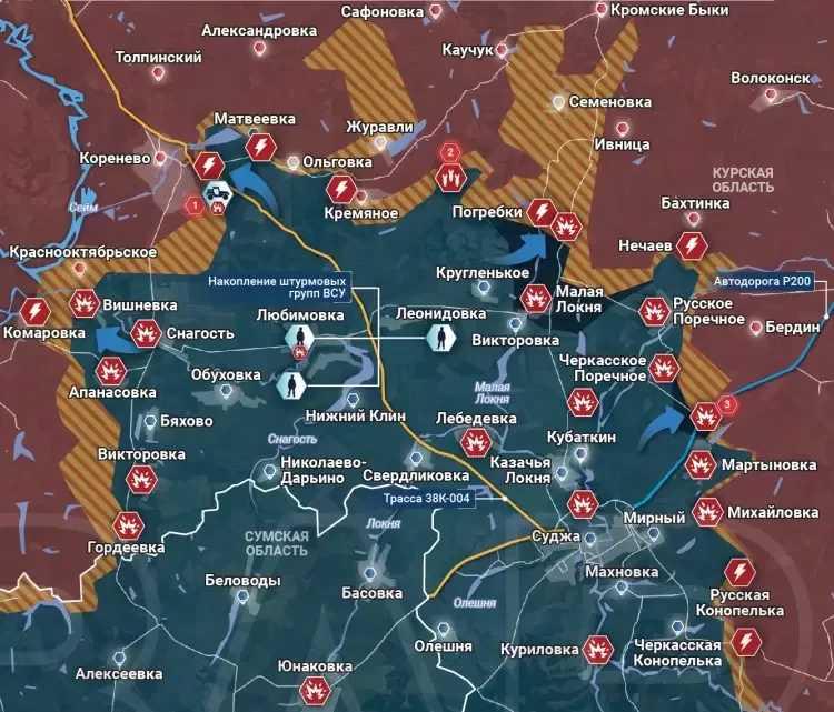 В Суджанском районе ВСУ продвинулись в районе Погребков. Также ряд источников сообщает, что противник взял Малую Локню. Минобороны ВС РФ в своей сводке сообщало, что по населённому пункту и его окрестностям наносились удары, это косвенно подтверждает потерю Малой Локни. Об этом сообщает PulsePen.