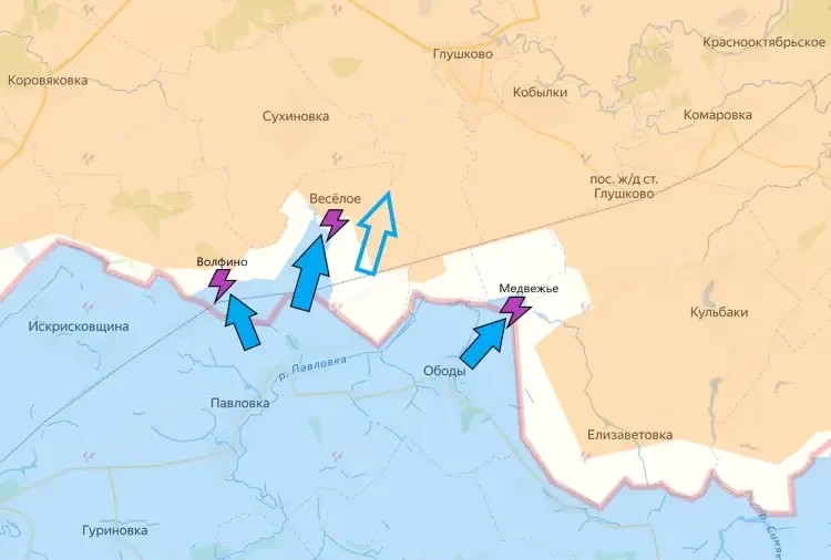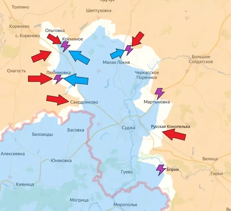 В Суджанском районе ВСУ пробуют атаковать севернее Малой Локни, но натыкаются на встречные бои. На восточном участке сообщается об освобождении Русской Конопельки Армией России. Бои идут также в районе Мартыновки и западнее Борок.