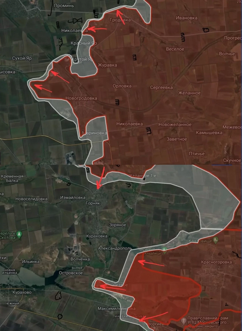 Западнее Красногоровки ВС РФ продвинулись на 4.2 км, под контроль перешла территория «Селидовской ИК №82», имеют тактические успехи в Остром и в направлении Александрополя.