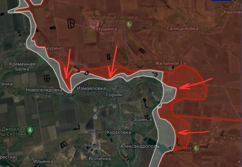 На Кураховско-Угледарском направлении северо-западнее Красногоровки российские войска продвинулись на участке шириной до 3.5 км и продолжают штурмовые действия в северо-восточной части Зоряного и севернее Жуковского водохранилища.