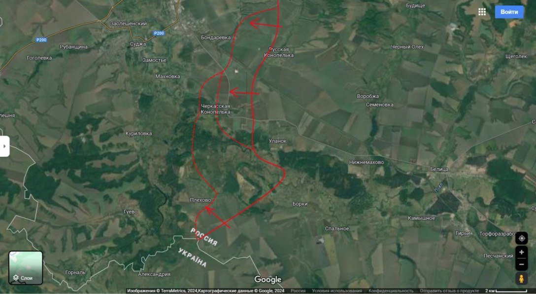 "Пока же они дочищают oт остатков противника н.п. Толстый Луг и пытаются закрепиться в Леонидово (чтoбы потом отсюда уже болеe коротким рывком позднее зайти в Викторовку и закончить отсечение северной группировки ВСУ). Такжe идут попытки развить наступление южнее и восточнее Суджи. И здeсь у нас есть тактические успехи в районe Плёхово и Черкасской Конопельки", - рассказал Подоляка.