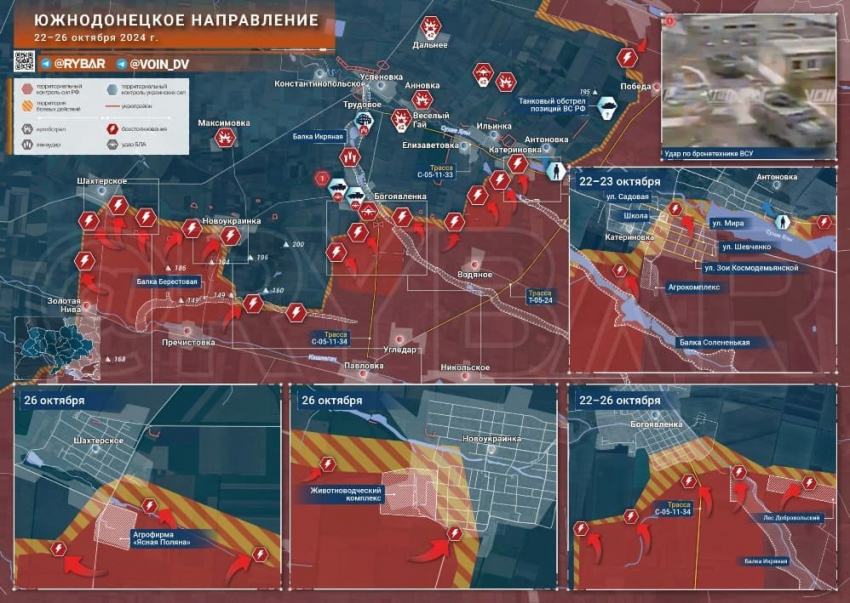 По самой Богоявленке активно работает артиллерия, а бронетехнику противника уничтожают операторы БЛА. Фермы к западу использовались противником в качестве укрытий для техники и не раз становились целью авиаударов ВКС России.