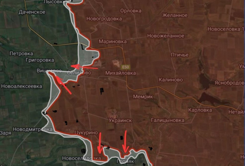 На Времевском направлении в районе Шахтёрского продолжаются встречные бои, российские войска давят в северном направлении. Севернее Пречистовки ВС РФ продвинулись на глубину до 1.15 км в направлении Новоукраинки.