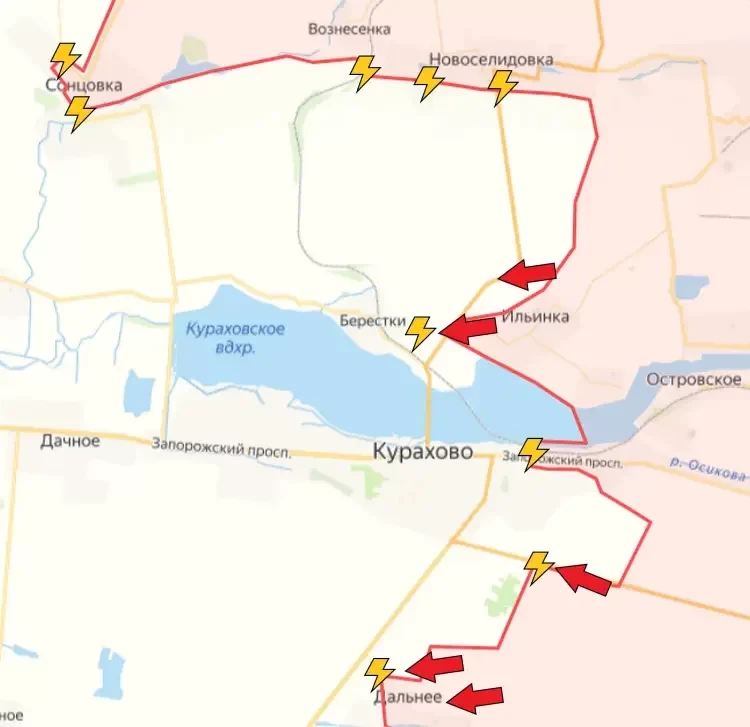 ВС РФ подошли к окраинам Новодаровки, ВСУ пытаются контратаковать в районе Ровнополя, Макаровки и Великой Новоселки, но безуспешно. Наши войска продвинулись по дороге Шахтерское-Максимовка-Успеновка, и теперь до Успеновки всего 1 км. В районе Антоновки, Елизоветовки и Трудового кипят бои. В районе Дальнего ВС РФ отбили у ВСУ опорный пункт на высоте, противник отошел в Анновку и Гигант. В Курахово ВС РФ накапливают силы на востоке города. ВСУ подорвали мост через балку, по которому снабжали группировку, и оттягивают силы в западную часть города, надеясь удержаться в многоэтажках и промзоне.