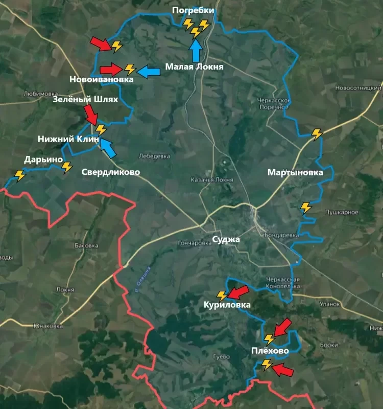 Бои также отмечены на всей протяженности линии фронта в Суджанском районе. Наиболее активными участками здесь остаются район Мартыновки и Плёхово, сообщает PulsePen.