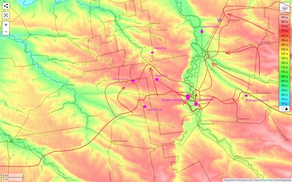 Основные наши усилия здесь сосредоточены северо-восточнее, где вчера мы сумели выбить противника из района Раздольного, что дает нам в перспективе возможность дальше двигаться на северо-запад, для более плотного блокирования района Большой Новосёлки и на север к трассе Запорожье-Курахово, для лишения снабжения этой важнейшей группировки ВСУ, которая по политическим мотивам режима в Киеве продолжает упорно сражаться в полуокружении.