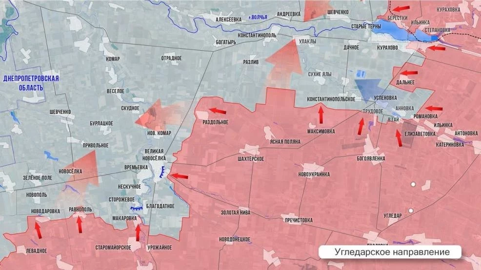 На Угледарском участке ВС РФ отбили около 20 км² восточнее Благодатного и ведут ожесточенные бои западнее Раздольного. Дерзким рейдом наши прошли в тыл гарнизону ВСУ в Великой Новосёлке и высадили десант в Новый Комар, сообщает в Telegram-канале Олег Царёв. ВСУ контратакуют, чтобы не допустить прорыва ВС РФ к Новоочеретоватому, который позволит нашим выйти в тыл ВСУ у Днепропетровской обл и в тыл Покровской группировке. Севернее Богоявленки ВС РФ вышли к ротному опорному пункту перед Успеновкой и усилили давление на Трудовое с севера. Из Ильинки, об освобождении которой объявило сегодня МО, ВС РФ ведут штурм Романовки, Веселого Гая. Подошли наши и к восточным окраинам Анновки. В Курахово отмечено значительное продвижение наших штурмовиков в центре, зона боёв расширяется и на юг и подходит к мкр Южный.