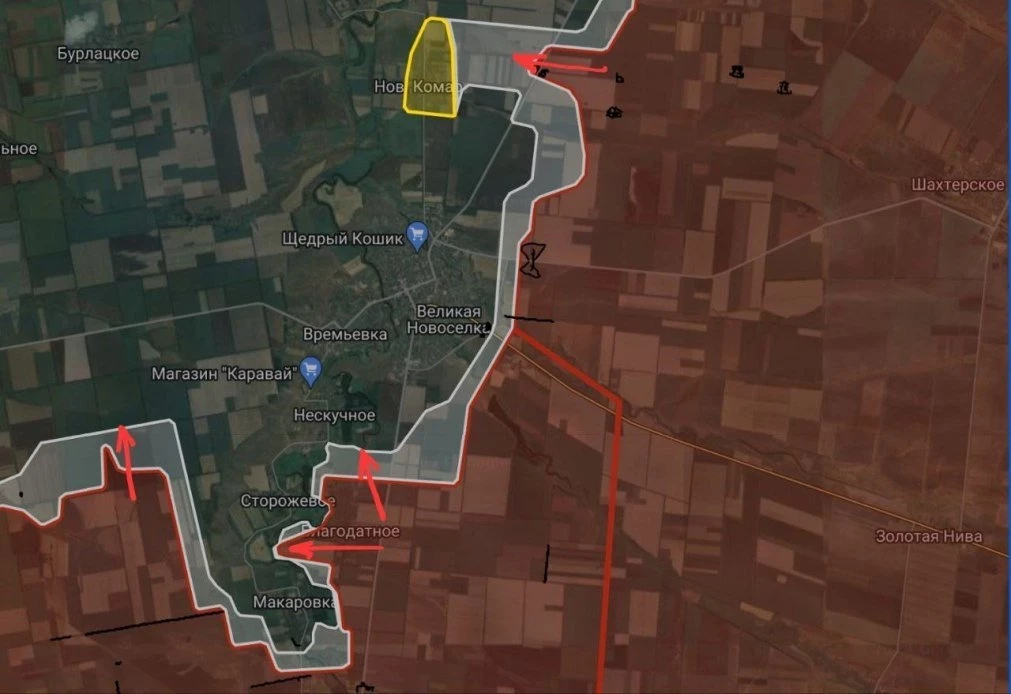 На Великоновосёлковском направлении ВС РФ ведут штурмовые действия в направлении Новый Комар. Российские войска давят южнее Великой Новосёлки в направлении Нескучного и Сторожевого, сообщает Telegram-канал "БелВПО".