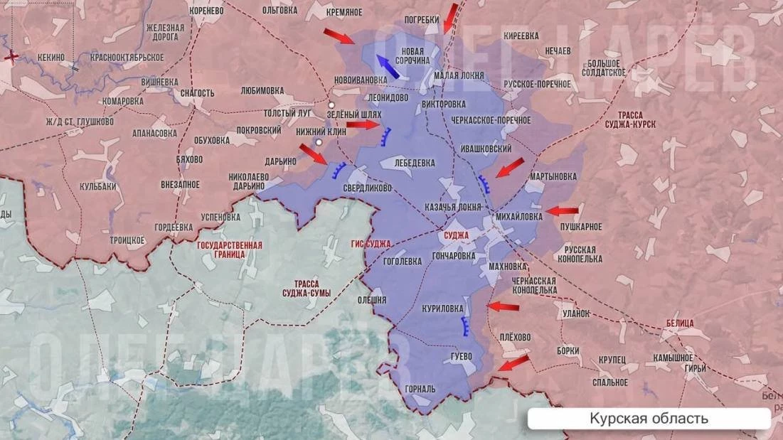 Самым активным участком сейчас является район Плёхово на юге-востоке от Суджи. Здесь идут тяжелые бои, наши пытаются продвинуться к Гуево и Куриловке.