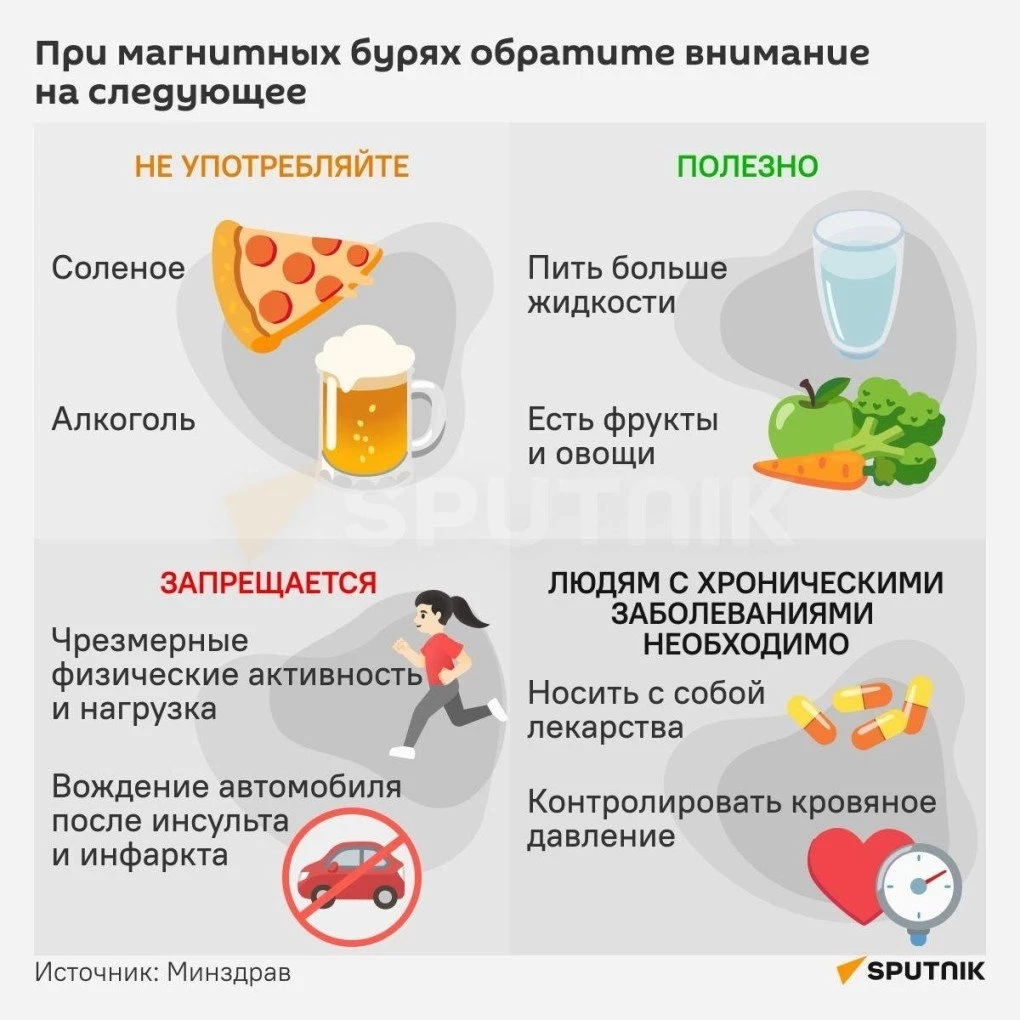 Он призвал в такие дни отказаться от алкоголя, а также не есть тяжелую пищу. Больше пить воды и следить за самочувствием, особенно метеозависимым.