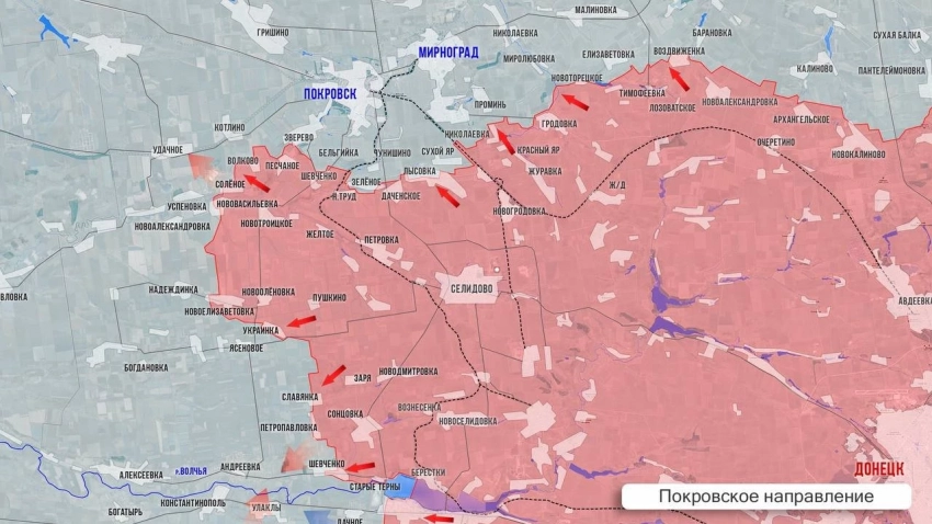 На восточном фасе Покровского направления армия России, продвигаясь от Воздвиженки, буквально проломила оборону ВСУ перед трассой Покровск- Константиновка, вышла к ней и закрепилась восточнее Мирнограда. Идут бои за Барановку и Водяное Второе. На западном участке армия России прорывается южнее Котлино и северо-западнее Волково. Выбив ВСУ на северную часть карьера в районе Солёного, наши сражаются за выход к Удачному. До него - менее 2 км. Южнее по фронту ВСУ зацепились в западной части Нововасильевки, там продолжаются бои. Наши бьются за Надеждинку, Ясеновое.