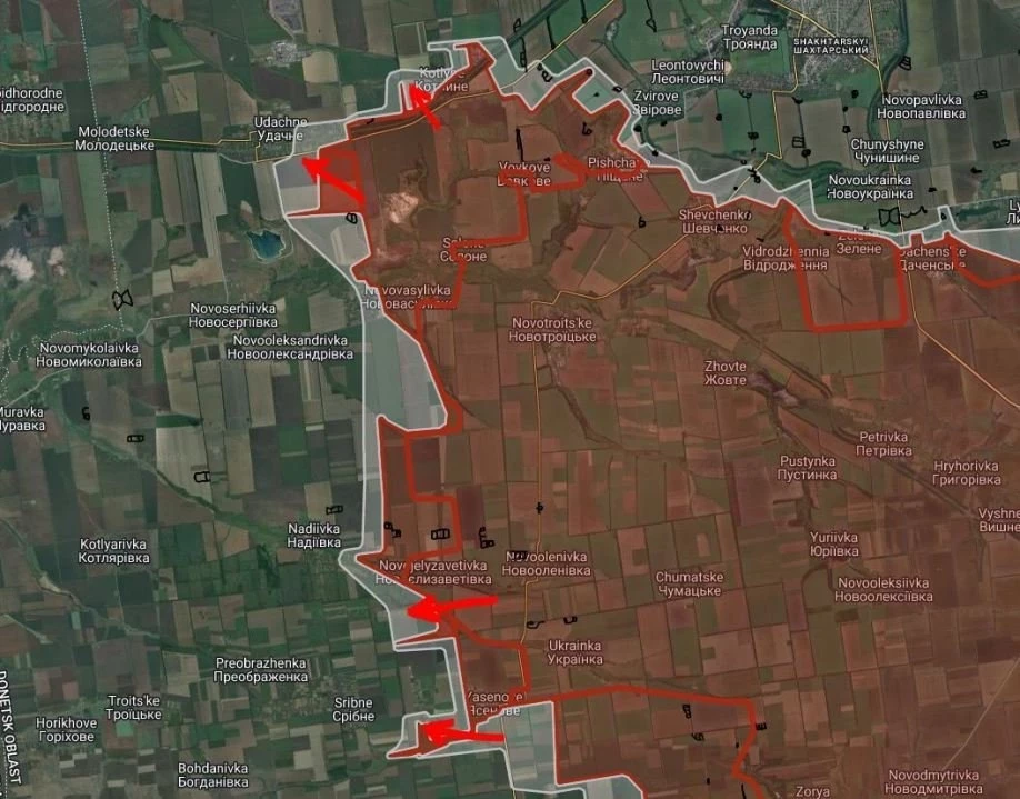 ВС РФ имеют тактические успехи западнее Котлино, продвинулись на глубину до 750 м, южнее Удачное на глубину до 1.82 км и южнее Новоелизаветовки на глубину до 1.35 км.