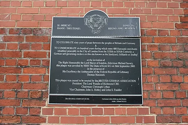 Чтобы отпраздновать шестьдесят лет мира между народами Британии и Германии и отметить шестьсот лет, в течение которых около 400 ганзейских купцов мирно проживали в лондонском Сити с XIII по XIX века, в немецком самоуправляемом анклаве, известном как «Стилъярд» или «Штальхоф», была установлена ​​по заказу Британско-германской ассоциации эта мемориальная доска. По приглашению лорд-мэра Лондона, олдермена Майкла Сэвори, эта мемориальная доска была открыта герцогом Кентским 26 сентября 2005 года в присутствии посла Федеративной Республики Германия Томаса Матуссека. В конце мемориальной доски написана цитата, написанная Фридрихом Шиллером в драме «Вильгельм Телль», написанной им в 1804 году: Das Alte stürzt, es ändert sich die Zeit, und neues Leben blüht aus den Ruinen («Старое рушится, времена меняются, и новая жизнь расцветает на руинах»). Источник: London Remembers