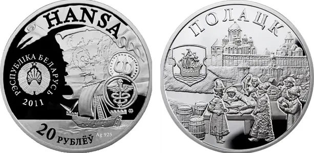 В 2011 году Национальный банк Республики Беларусь выпустил серебряную памятную монету «Полоцк. Ганзейский союз». В 1210 году в Полоцке был основан Немецкий двор, а в 1229 году город вошел в состав Ганзейского союза. Через Полоцк шли торговые пути в Орду — он был крупнейшим транзитным городом для ганзейских товаров, поставляемых на Восток, а его основным экспортным товаром был лес и полоцкий мед, который в те времена был почти что единственной сладостью для небогатых жителей Европы. Полоцк принимал участие и в торговых войнах — он к началу XV века полностью перекрыл доступ северогерманских купцов к рынкам Витебска и Смоленска, вынуждая их продавать свои товары в Полоцке только оптом, после чего эти товары уже шли на Восток под «крышей» полоцких купцов. А в июне 2009 года Полоцк стал членом Нового Ганзейского союза. Художник: Доброхна Сураевска (Польша).