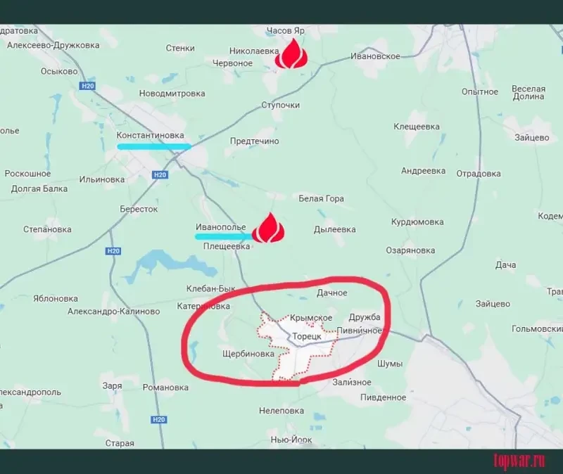 Успешное продвижение с юго-востока обеспечит взятие Константиновского гарнизона противника в клещи – с учётом того, что близок к освобождению и находящийся в нескольких километрах восточнее Константиновки Часов Яр. Что немаловажно, и Торецк, и Часов Яр находятся на высотах относительно той же Константиновки. Это неоспоримое преимущество.