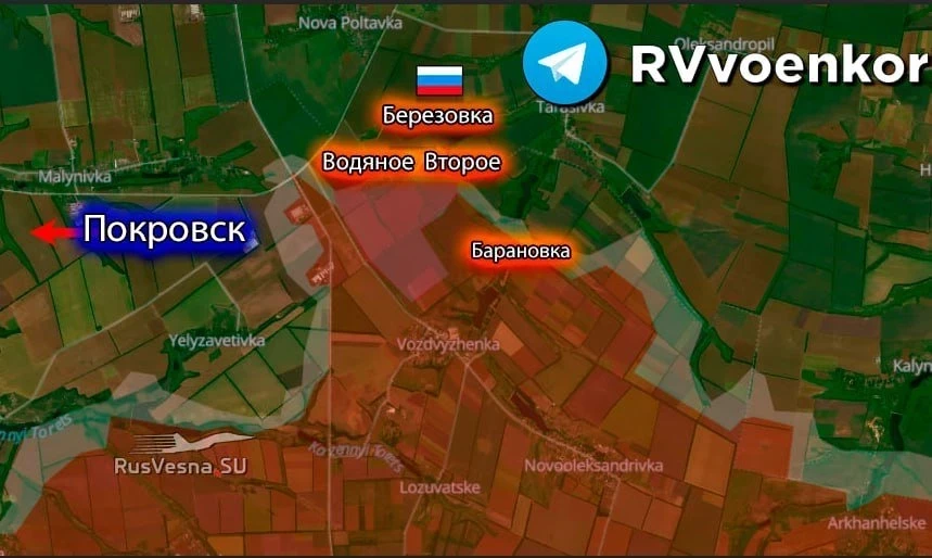 Тем временем, российские подразделения продолжают выполнять поставленные перед ними задачами. На правом фланге Покровского направления силы РФ уверенно развивают наступление, освободив населённый пункт Берёзовка, расположенный восточнее Мирнограда. Ранее российские части продвинулись к трассе Покровск-Константиновка, взяв под контроль сначала Барановку, а затем Водяное Второе и Зеленое Поле.