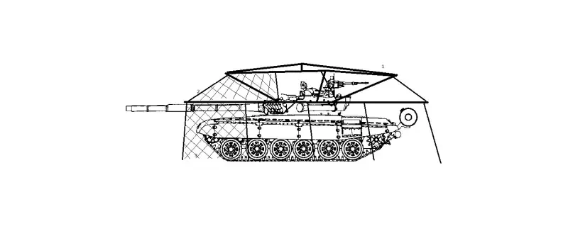 И ещё пара особенностей. Во-первых, по бокам одно или два боковых полотнища сетки оставляются незакреплёнными с боков, к свисающим тросам, чтобы экипаж мог их откинуть и пролезть к люкам на башне. Это также необходимо при загрузке боеприпасов. Во-вторых, на самой верхней перемычке купола стоит установить кольцо для крюка крана, чтобы при ремонте или длительном обслуживании всю защиту можно было открутить (для чего крепления стоек опоры первого, верхнего, обруча надо сделать съёмными) и снять с помощью крана, а потом так же поставить на место.