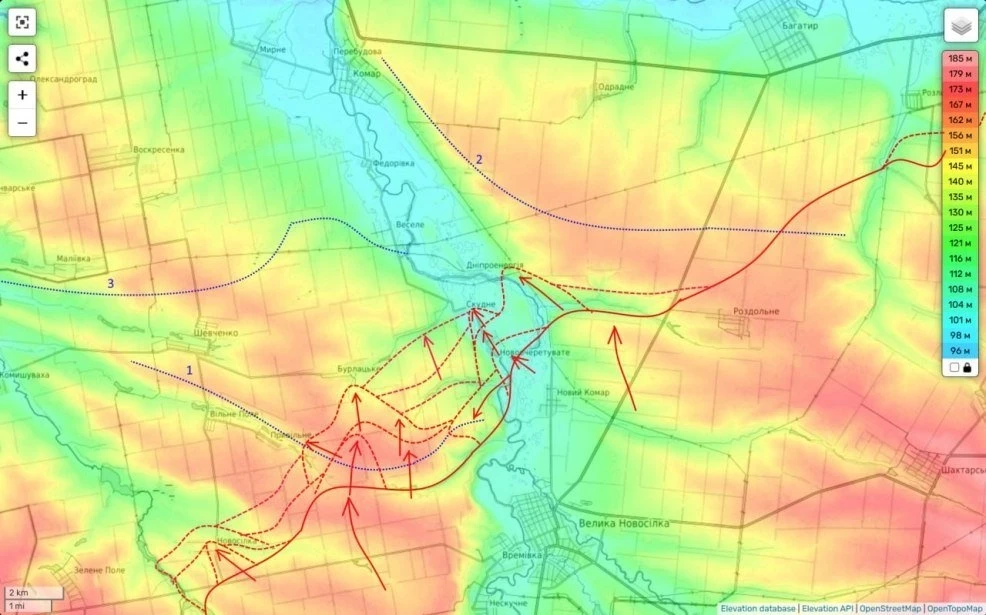 Севернее Большой Новосёлки, после прорыва обороны ВСУ севернее Времеевки и в районе Новоочеретиного, продолжается постепенное выдавливание сил противника в районе Бурлацкого, Привольного и Скудного.