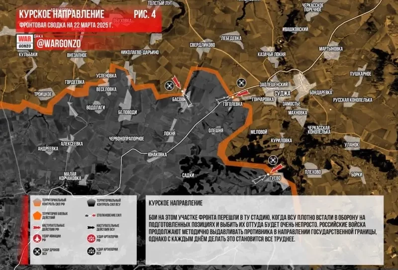 На Суджанском направлении противник себя никак не проявляет, атак нет. На Плеховском направлении ВСУ обороняются в районе Гуево — Горналь. Поступает информация, что ВС РФ осталось полностью освободить два населенных пункты в курском приграничье — Олешню и Горналь, при этом продолжаются бои в Гуево, куда наши штурмовики вошли в середине марта.