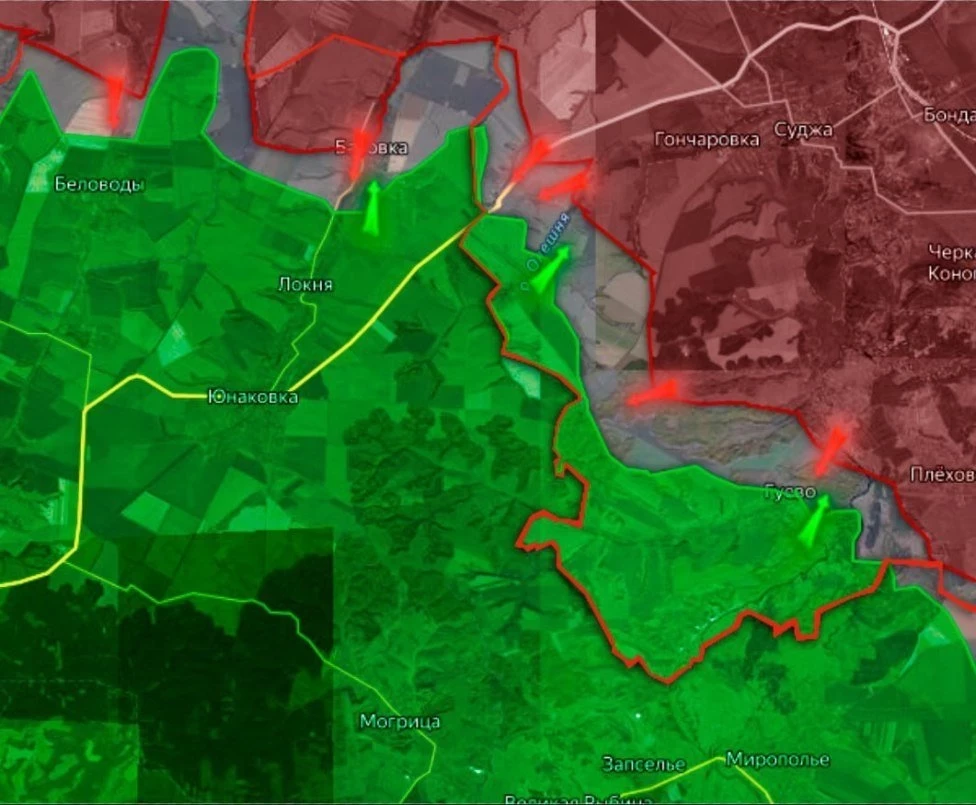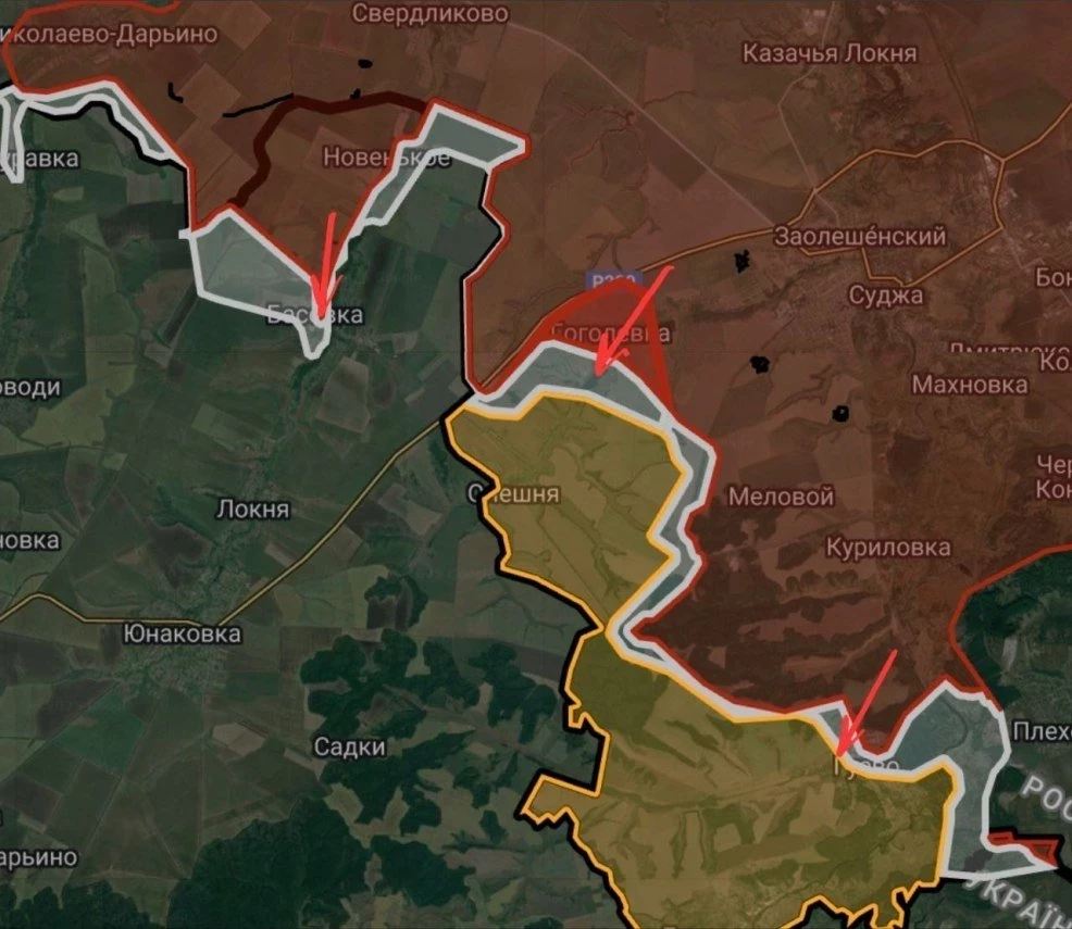 По словам авторов канала, на Сумском направлении ожесточенные боевые действия продолжаются в Гуево (Курская область), в окрестностях хутора Олешня (Курская область), а также в районе Басовки (Сумская область).