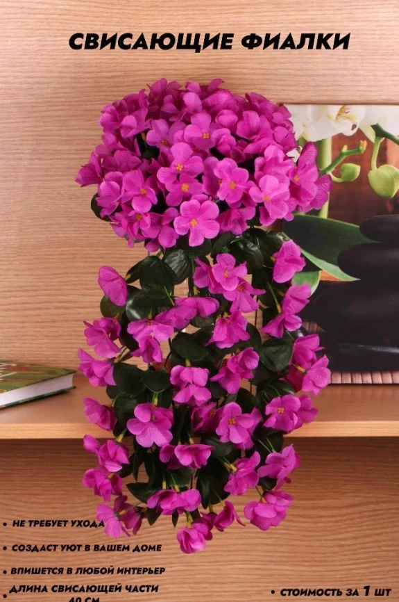 Фиалки сухоцветы – элегантное и практичное украшение для любого интерьера. Эти нежные розовые цветы добавят свежести и уюта в ваш дом, офис или зону отдыха. Свисающие фиалки смотрятся особенно эффектно в подвесных композициях, на полках или в кашпо, создавая впечатление живого растения. Они идеально подходят для декора стен, окон, балконов и даже уличных террас, так как не боятся изменений температуры и влажности Длина композиции – 40 см, что делает её универсальной для различных интерьерных решений. Цветы выполнены из качественного текстиля, имитирующего структуру натуральных лепестков, а зелёные листья придают композиции естественный объём Фиалки не требуют ухода – достаточно периодически протирать их от пыли. После транспортировки рекомендуем подержать их над паром или немного нагреть феном, чтобы вернуть форму и пышность.