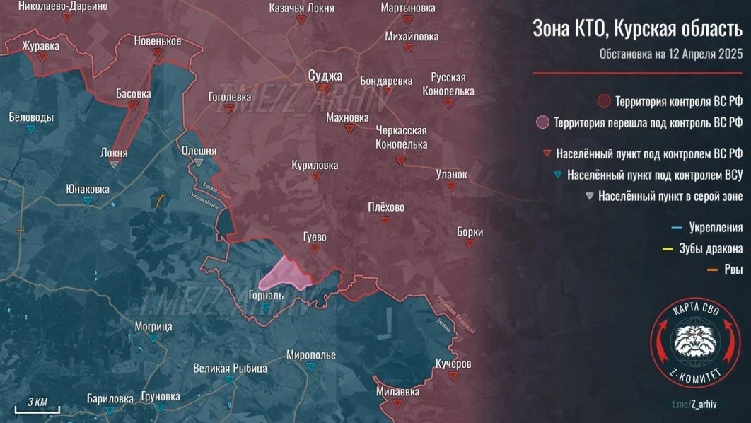 12 апреля весь день шли упорные бои на приграничных участках Курской области России и Сумской области Украины. По имеющимся данным, в Курской области подразделения ВС РФ проводили активные штурмовые действия по освобождению от ВСУ населенного пункта Горналь и территории Свято-Николаевского Белогорского мужского монастыря в этом селе, превращенном украинскими военными в настоящий укрепрайон.
