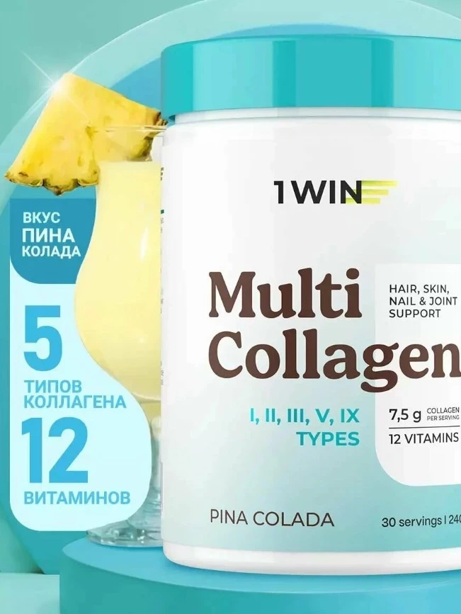 Мульти Коллаген с витамином C от 1WIN — это мощная добавка с 5 типами коллагена (I, II, III, V, IX), которая помогает восстановить упругость кожи, укрепить суставы и волосы. С витамином C, необходимым для усвоения коллагена, продукт активирует процессы регенерации и способствует улучшению общего состояния организма. Состав включает также витамины A, E, D3 и группу B, что делает добавку эффективным средством для общего омоложения и поддержания здоровья. Вкус Пина Колада придает процессу приема удовольствие.