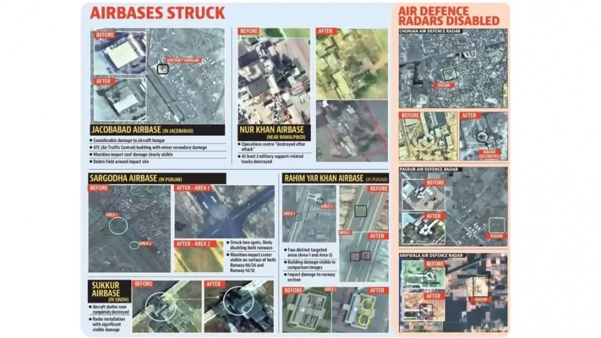 В частности, на авиабазе Нур Хан в Равалпинди повреждены операционное здание и техника, а в Саргодхе (провинция Пенджаб) взлётно-посадочная полоса получила два попадания, что временно вывело её из строя.