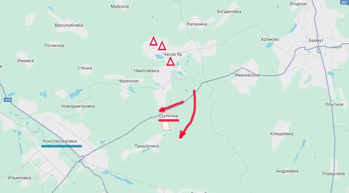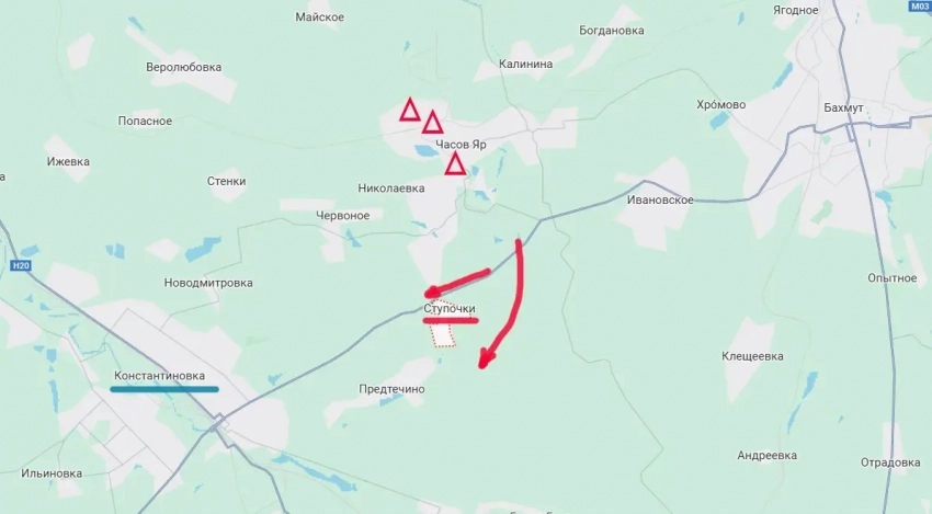 Тем временем украинские паблики рефлексируют по поводу того, что российские войска, ранее заняв ключевые высоты в городе Часов Яр, теперь обходят его южнее. В частности, под контроль армии России на минувшей неделе перешло село Ступочки. А это всего 6 км от Константиновки.