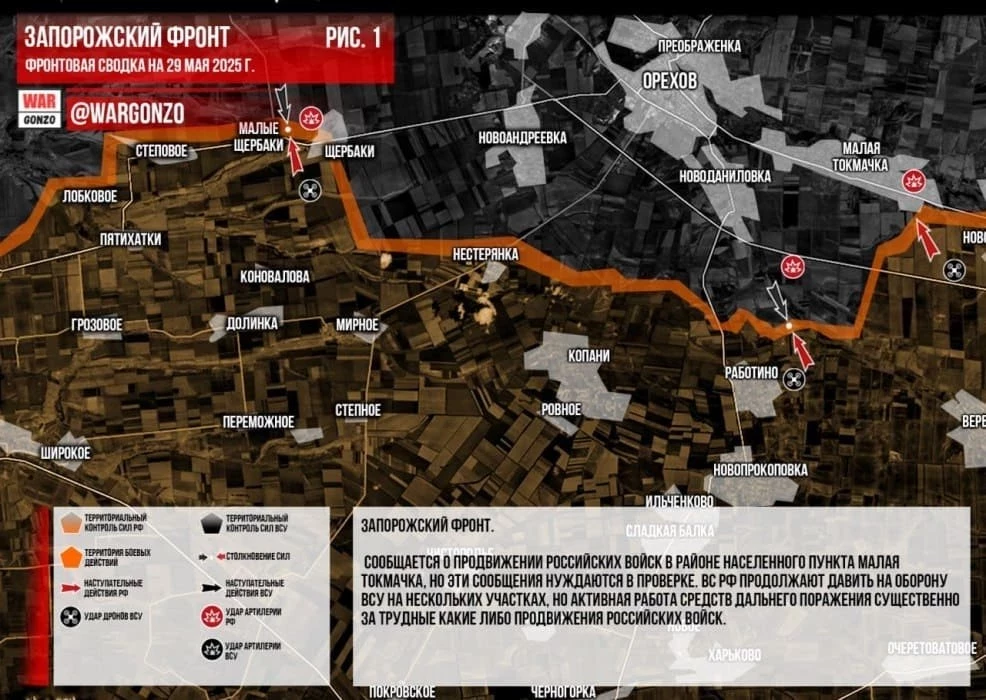На Запорожском направлении, как отмечает Telegram-канал Wargonzo, имеет место продвижение российских войск в районе населённого пункта Малая Токмачка, но эти сообщения нуждаются в проверке. ВС РФ продолжают давить на оборону ВСУ на нескольких участках, но активная работа средств дальнего поражения существенно за трудные какие либо продвижения российских войск.