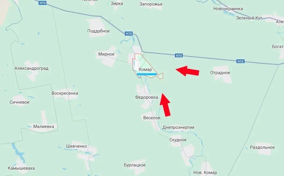 Российские войска продолжают продвижение на западе ДНР, в районе автомобильной дороги Н15, что ведёт в сторону Запорожья. На сегодняшний день армия России расширяет зону контроля западнее Отрадного, планомерно продвигаясь к селу Комар. При этом продвижение к Комару идёт и с юга, со стороны ранее освобождённого Весёлое. И противнику на этом участке совсем не весело.