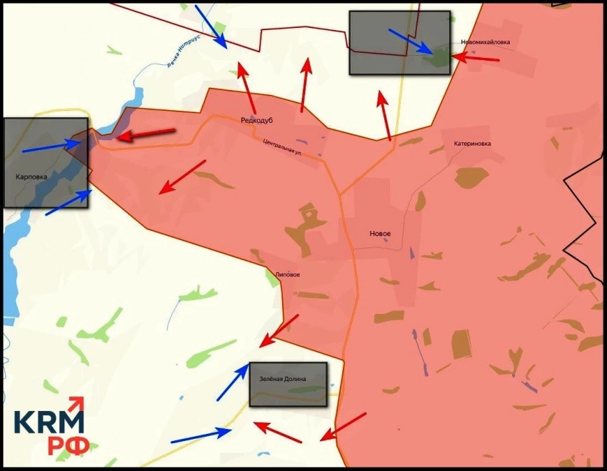 На Краснолиманском направлении идёт штурм Карповки и Зелёной Долины. Контроль над ней критичен - село стоит на пути к рубежу Шандриголово-Дробышево, сообщает в своём Telegram-канале военкор Евгений Лисицын.