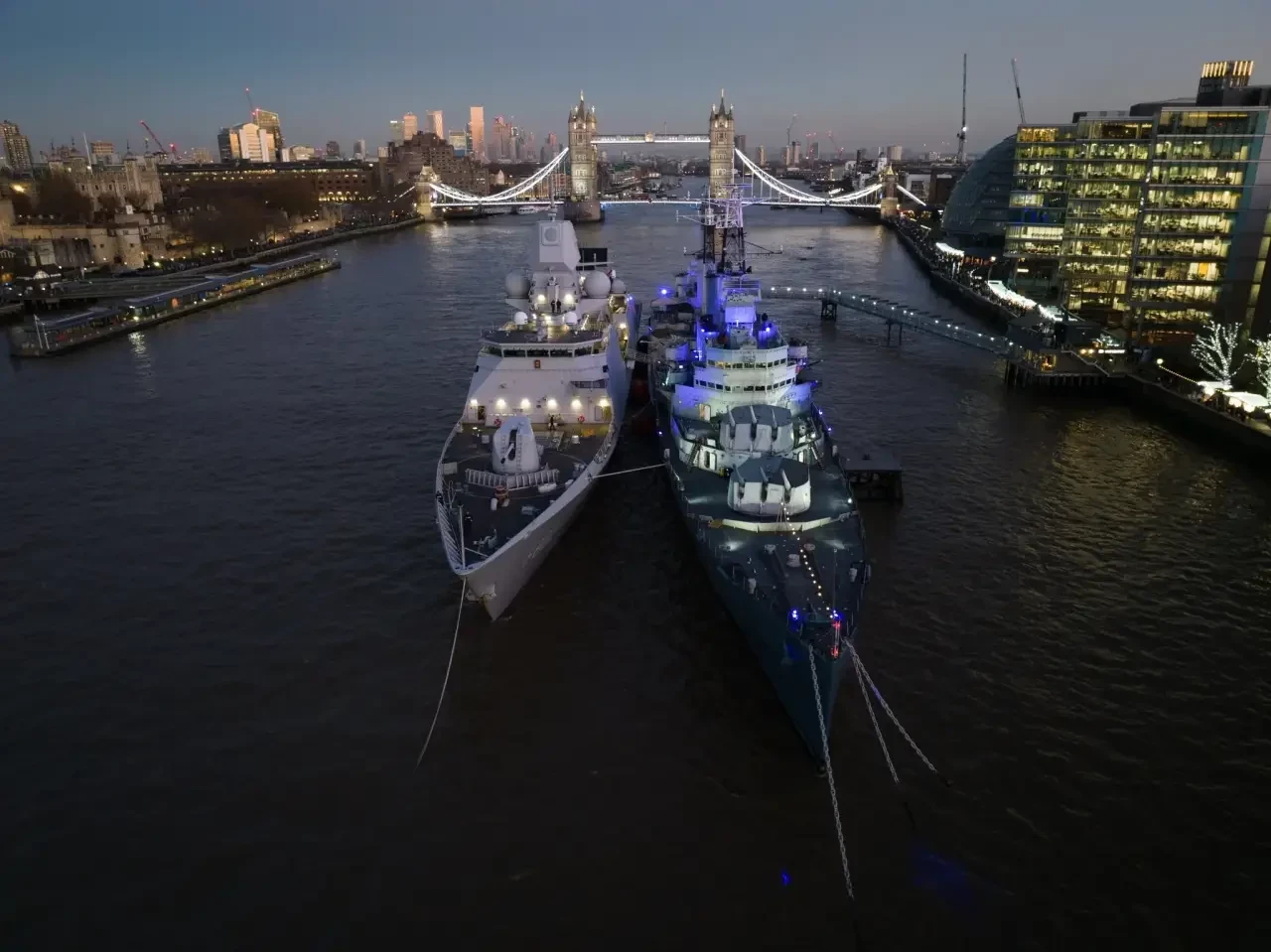 Легендарный «Белфаст» (1938г.) и миниатюрный фрегат ВМС Нидерландов, уступающий по водоизмещению крейсеру почти в три раза.