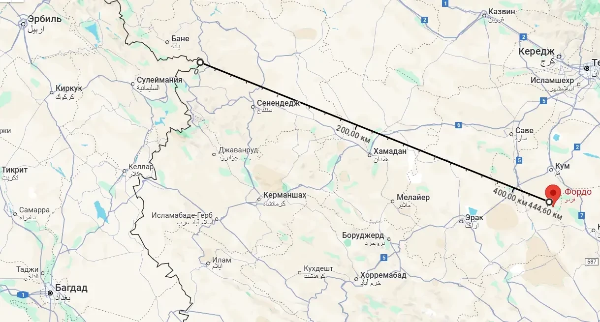 Для сухопутной локальной операции могут быть использованы возможности по высадке десанта с моря, а также переброска нескольких диверсионных групп через сухопутную границу Ирана. В качестве второго варианта рассматривается сценарий с использованием Иракского Курдистана. Во-первых, курды относительно лояльны по отношению к Израилю, во-вторых, до объекта в Фордо кратчайшее расстояние от сухопутной границы иностранного государства - именно от Ирака. Минимальное - около 410 км. От границы Иракского Курдистана – около 440 км. Но это всё по прямой. А по прямой в Иране, мягко говоря, непросто.