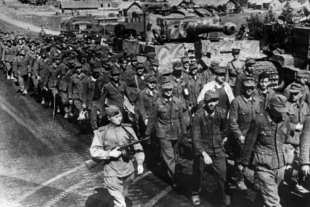 Колонна немецких пленных проходят мимо трофейного танка