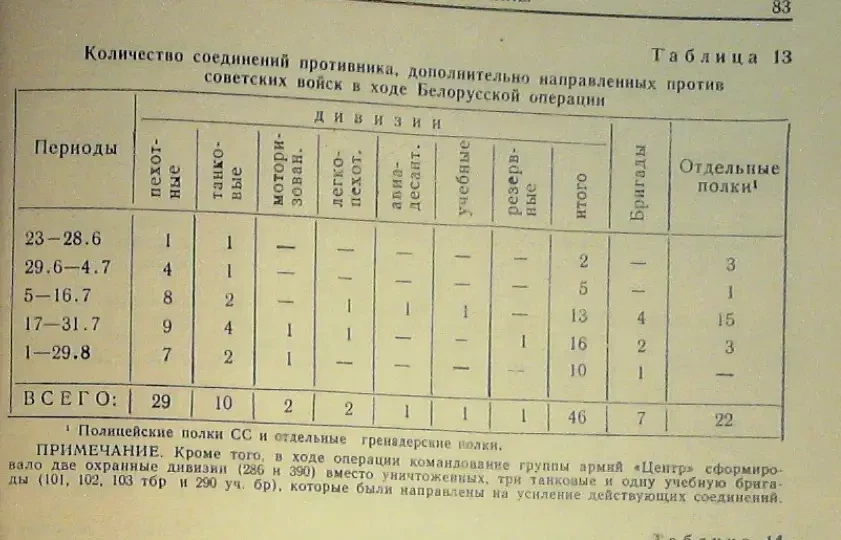 Эта таблица является наглядным примером того, как должен выглядеть полный учёт немецких сил. Подобных данных по немецким силам в полосе операции «Багратион» нет. Но такие сведения необходимы для полного учёта немецких сил в операции.