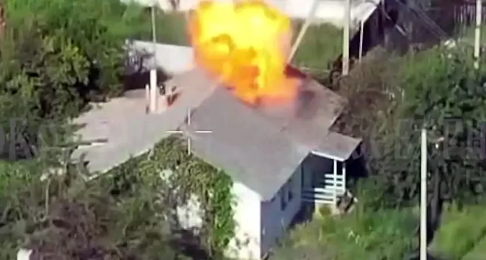 В сети показаны кадры атаки по пункту управления БПЛА противника. В результате точных попаданий наших дронов, первый из которых угодил в крышу, здание, где размещался ПУ врага, вспыхнуло ярким пламенем, да и выгорело дотла.
