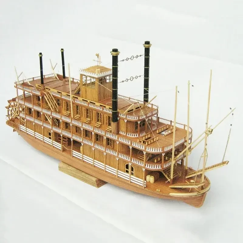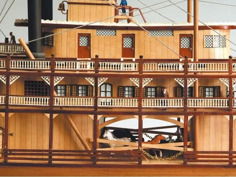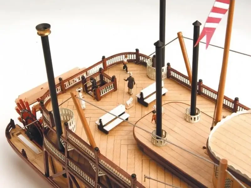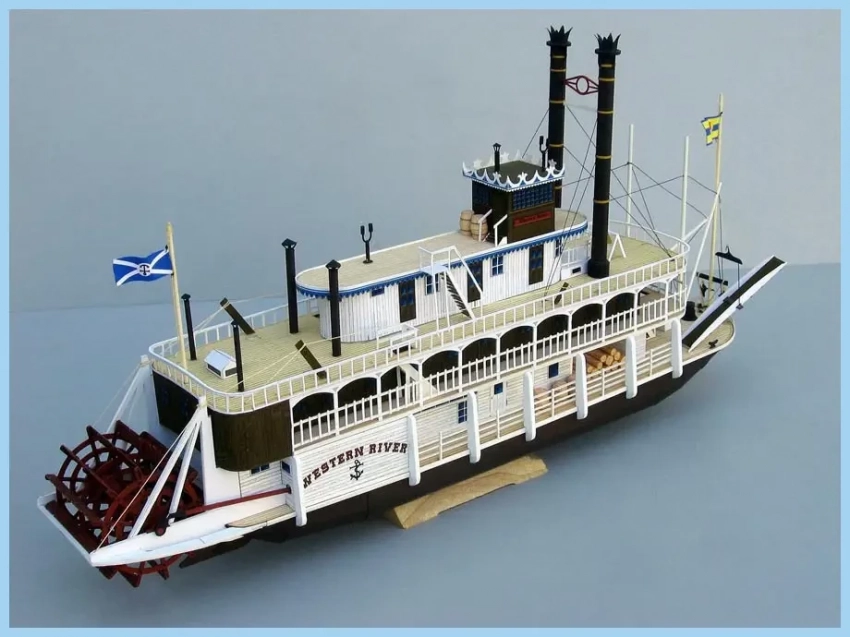Интересным образом подошли к теме моделирования миссисипских пароходов в отечественной компании «Семейная фотостудия» из Санкт-Петербурга. Они взяли за основу бумажную модель фирмы «ДрафМодел» из их журнала № 1 за 2009 г. и весь силовой набор корпуса и палуб изготовили из тонкого, но прочного картона, методом лазерной резки. То есть эти детали просто выдавливаются из картонных листов, а затем уже на них наклеиваются цветные элементы из бумаги. Хотя, разумеется, большая часть деталей парохода так бумажными (в силу их масштабной толщины!) и осталась. Журнал с цветными развертками плюс лазерная резка стоят 1600 р., что вполне соответствует ожидаемому качеству. Кстати, и бумага, на которой напечатаны детали модели, значительно лучше той, что использовалась поляками в «Малом моделяже» в прежнее время. Масштаб модели 1:100.