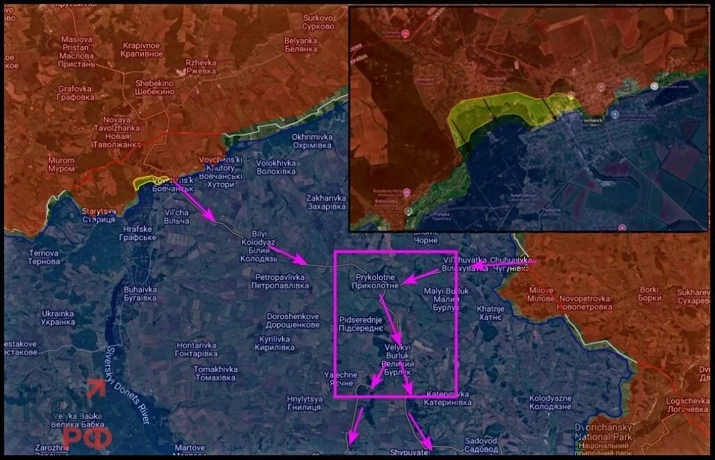 На Купянском направлении без особых изменений. Продолжаются бои на правом берегу Оскола. Со стороны Двуречной ВС РФ пробиваются к Кутьковке.