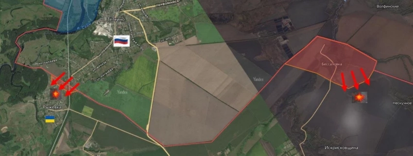 На западе Константиновского фронта ожесточенные бои в районе Яблоновки - Александро-Калиново. Армия России старается перерезать логистику ВСУ южнее Клебан-Быкского водохранилища, к которому приближается с востока, а также в районе Щербиновки. Центр и восточная часть Яблоновки уже под контролем наших войск. На Александро-Калиново наши напирают с северо-запада и юго-востока, западнее Катериновки выбивают противника из лесов. В Щербиновке наши зачищают южные позиции, пробиваются к центру. Позиции восточнее и северо-восточнее пока переходят из рук в руки. По последним данным, шахта им. Матроны Московской снова занята ВСУ, а вот севернее наши выбили ВСУ с позиций. На восточном фланге направления идут тяжёлые бои на участке Дылеевка-Курдюмовка-Андреевка.