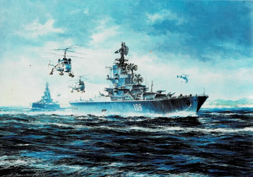 17. Охотники за субмаринами – II. Противолодочные крейсера «Москва» и «Ленинград». Бумага, темпера, гуашь, 30х42, 2002 г.