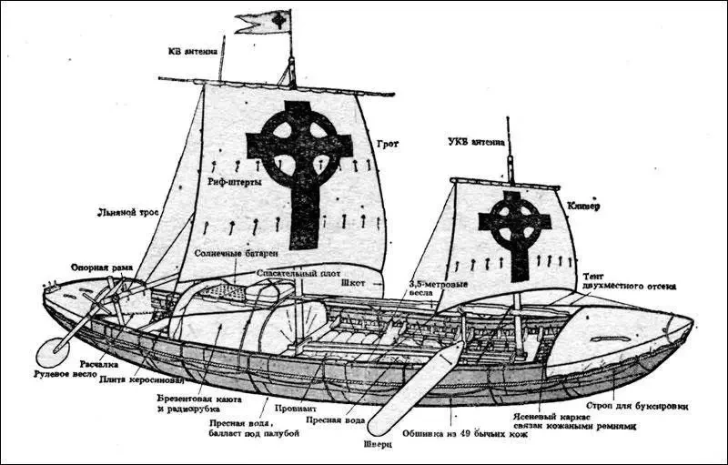 В качестве плавсредства монахи использовали куррах (ирландское currach или curach) — разновидность традиционных ирландских и шотландских лодок с деревянным каркасом, обтянутым бычьими шкурами, дубленными в экстракте из дубовой коры и для водонепроницаемости смазанными жиром. Такая конструкция корпуса придавала ему эластичность и тем самым позволяла избегать повреждений от ударов волн и столкновений со льдами. Лодки оснащались уключинами для весел и одной-двумя мачтами с простейшим прямым парусным вооружением. Еще в письменных источниках времен Юлия Цезаря встречаются упоминания о куррахах, на которых кельты выходили в Северную Атлантику. Подобные лодки для ловли рыбы и перевозки небольших грузов до сих пор строятся в Ирландии, Шотландии и Уэльсе, хотя из более современных материалов и иногда оснащаются подвесными моторами.