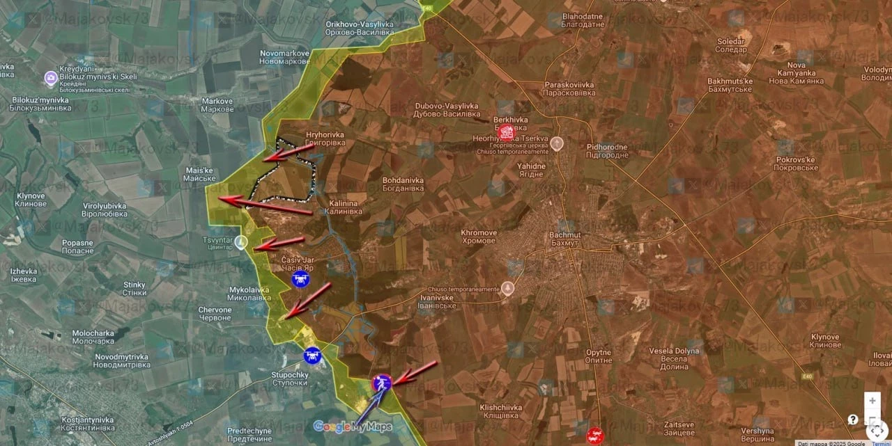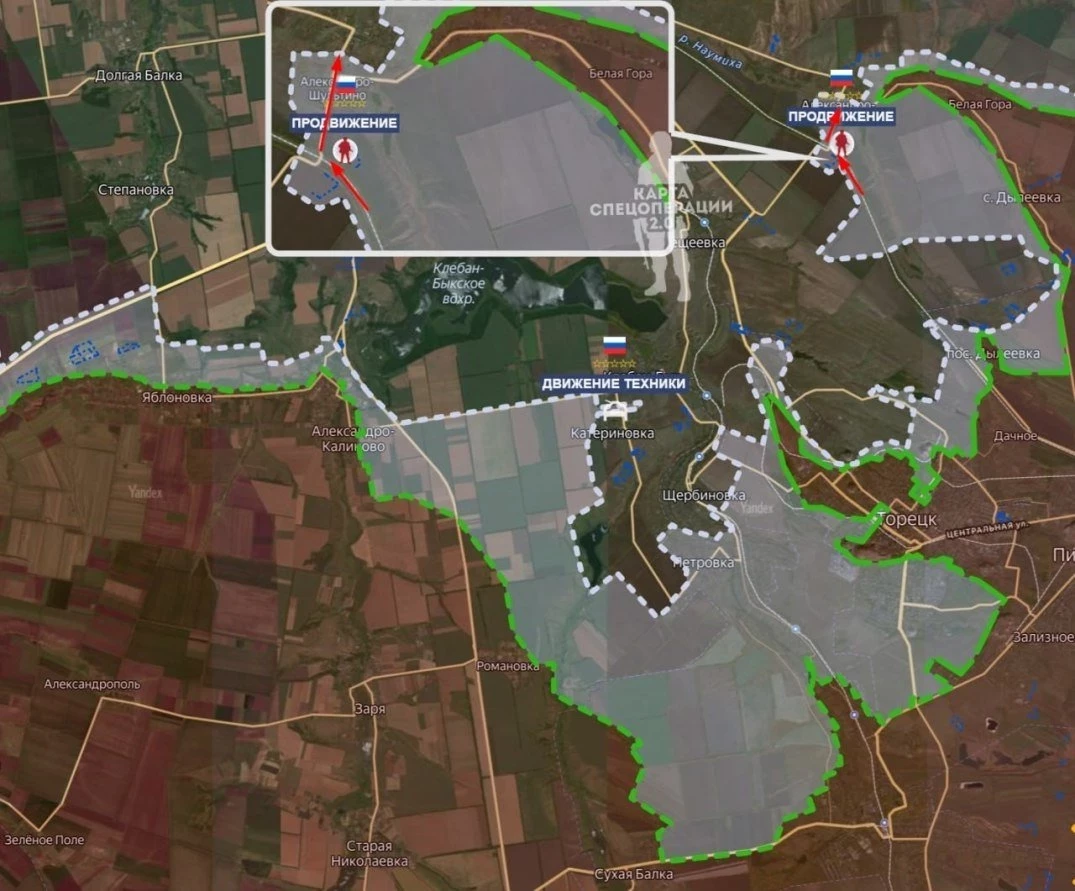 На Константиновском фронте ВС РФ стараются продавить оборону в районе Полтавки и Попов Яра, есть продвижение по лесополосам восточнее этих сёл. Южнее Клебан-Быкского водохранилища идут бои в Катериновке, и в районе Клебан-Быка. Наши части атакуют артиллерией и дронами северную часть Щербиновки. Есть продвижение южнее Александро-Шультино, ВСУ контролируют часть села севернее р. Наумиха.