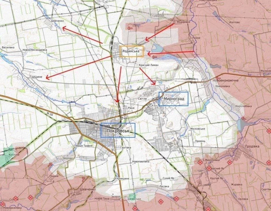 На Покровском участке позиционные бои юго-западнее Покровска. В районе Чунишино и Лысовки продолжаются попытки проломить оборону противника. Севернее Мирнограда в районе Красного Лимана и Родинского продолжаются бои, причём в этот город ВС РФ зашли с востока и с севера. Еще севернее наши бойцы вышли к окраинам Шевченко и одновременно начали продвигаться к Гришино. ВС РФ ведут бои на подступах к Новому Донбассу, Рубежному и Кучерову Яру.